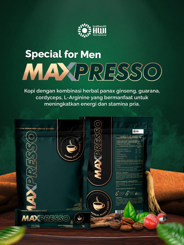MAXPRESSO MERUPAKAN KOPI DENGAN CAMPURAN REMPAH HERBAL KHUSUS UNTUK STAMINA PRIA. KOMPOSISI UTAMA MAXPRRESSO YAITU KOPI ARABICA, GINSENG, GUARANA, L-ARGININE, DAN CORDYCEPS.