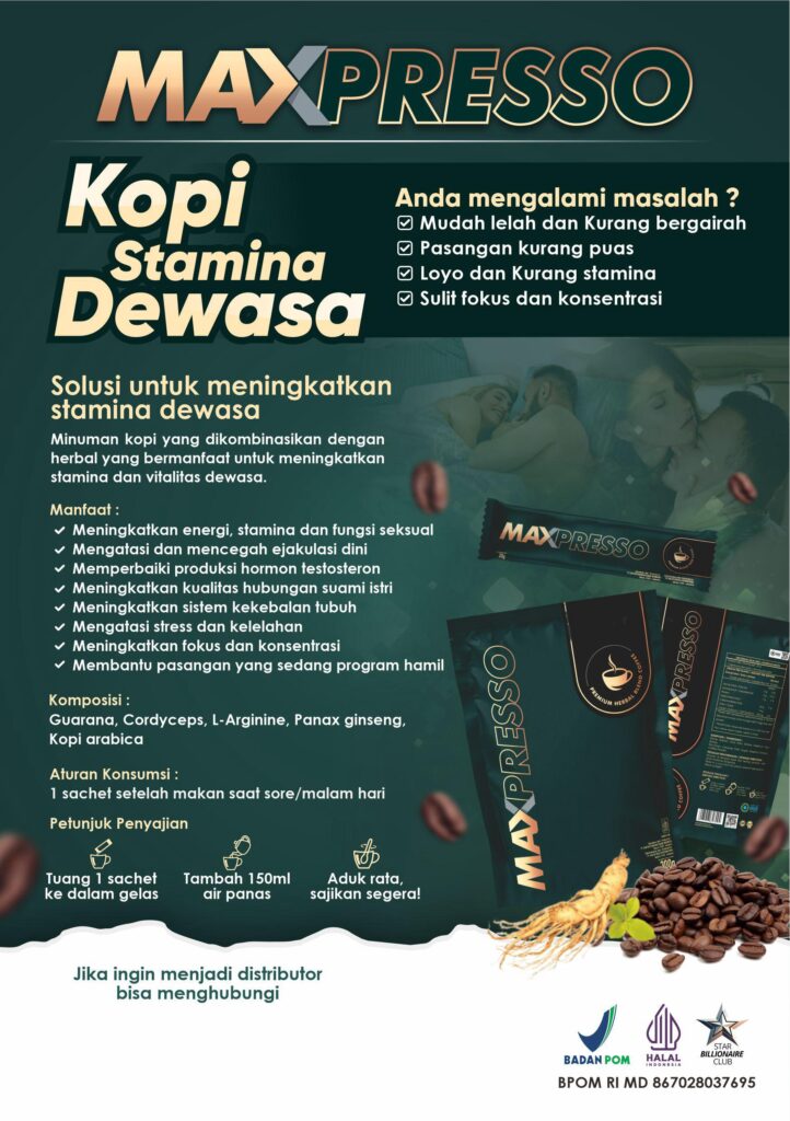 MaxPresso Kopi Kuat Pria Tahan Lama Paling Ampuh dan Aman Tanpa Efek Samping yang Bersertifikat BPOM RI. MaxPresso Juga Bisa Diminum oleh Perempuan untuk Penambah gairah.